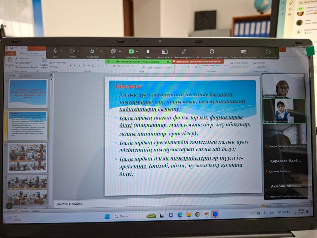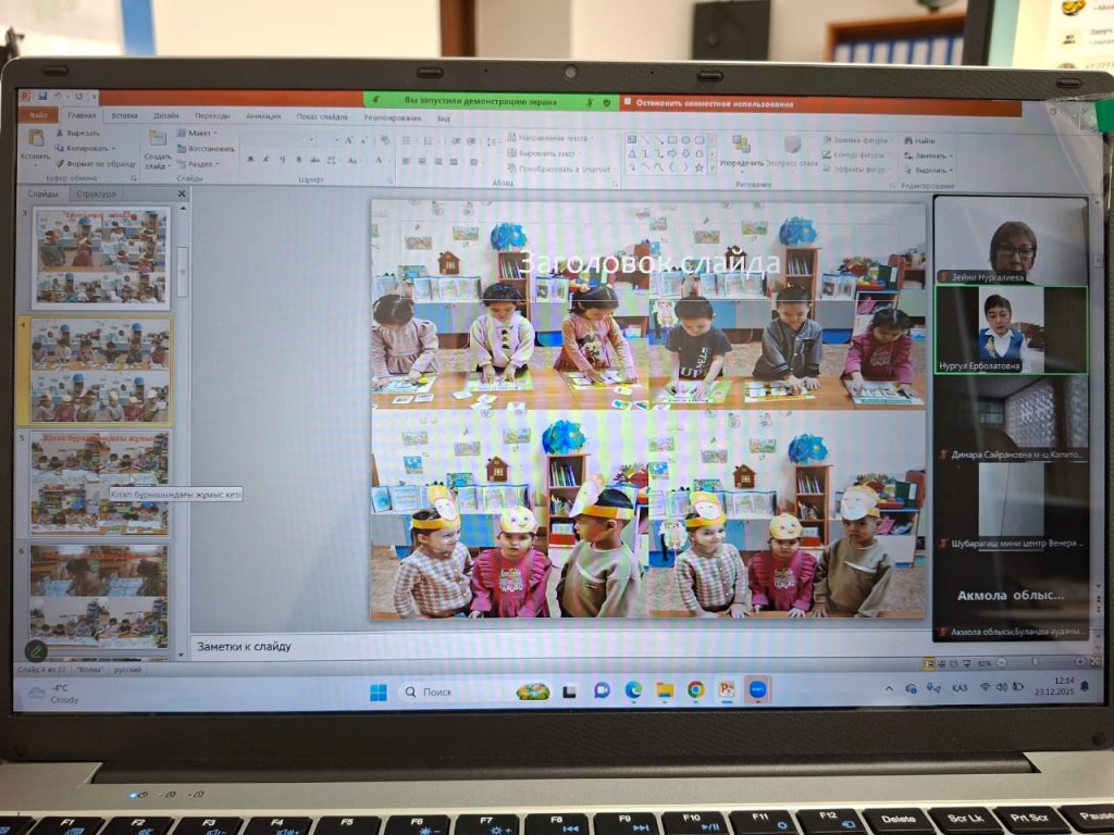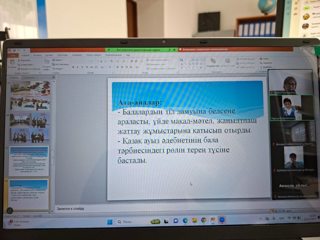 Желтоқсан айында құзыреттілік орталығының жоспарына сай «Дәстүр – ұлттық құндылықтарды ұлықтау» тақырыбында өсу нүктелерінің тпедагогтерінің қатысуымен зум форматында дөңгелек үстел ұйымдастырылды. Мақсаты: Педагогтердің өз тәжірибелерімен алмасуға жағдай жасау. Дөңгелек үстел барысында өсу нүктелерінің тәрбиешілері мен бөбекжайымыздың тәрбиешілер тақырып бойынша баяндамалар оқып, презентация жасап, өз іс- тәжірибелерімен алмасты. Отырыс соңында қатысушылар өз пікірлерімен бөлісіп, ұсыныстар шығарылды.