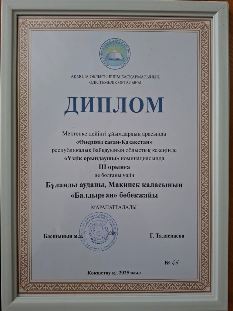 «Өнерім саған- Қазақстан!» ұлттық өнерді (балалар музыкалық аспаптарын, билерін, әндерін, тақпақтарын, қолөнерін) меңгерген барлық этностардың мектеп жасына дейінгі балаларының қатысуымен өтетін фестивальдің аудандық кезеңіне бөбекжайымыздан Ән жанры бойынша, «Татулықта күшіміз» әнімен Айтуған Айдана, Жұман Айгерім бүлдіршіндеріміз қатысқан болатын, жетекшісі музыка жетекшісі Берекелді Маржан. Нәтижесінде бүлдіршіндеріміз аудандық кезеңнен 1- орынға ие болып, облыстық кезеңде «Үздік орындаушы» номинациясы бойынша жүлделі ІІІ орынға ие болды. Бүлдіршіндерімізді құттықтаймыз!
